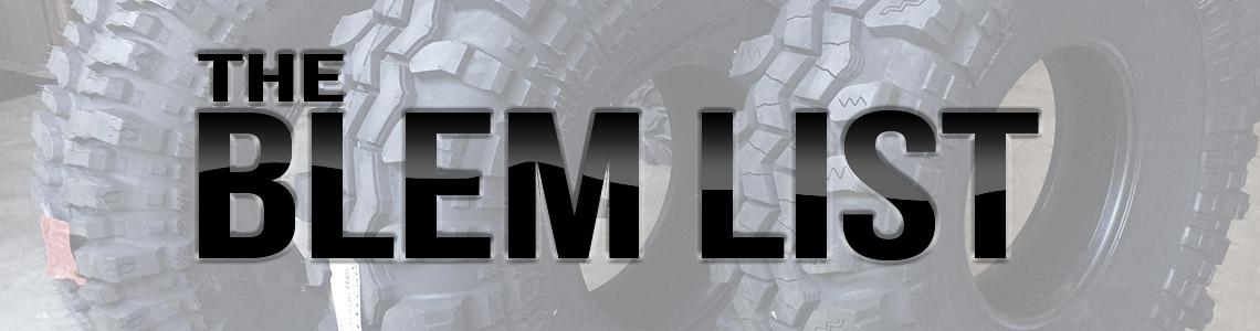 The Blem List is updated as tires are sold or received, and we do our best to keep this list up to date as possible. What is posted is what we currently have available. If a tire you are looking for on the Blem List is not listed, then we do not have it available as a blem.