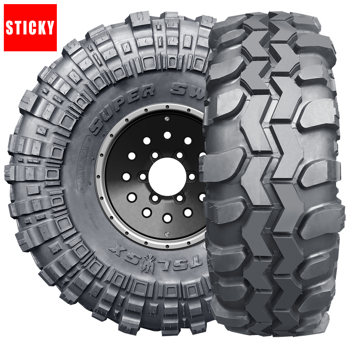 The Super Swamper TSL/SX offers unsurpassed traction under the toughest of conditions and gives off-road enthusiasts a tire that is both directionally and laterally stable and unmatched in performance.  Super Swamper TSL/SX tires are D.O.T. approved off-road, purpose built tires that also provide a smooth on-road ride.  TSL/SX tires are available in over 29 wheel size and width combinations including three, non-D.O.T. approved, off-road and competition only “Stickies”.  Note that the Super Swamper TSL/SX unique design requires strict attention to air pressure when run on the highway, and actual tread patterns may (slightly) vary based on tire size.